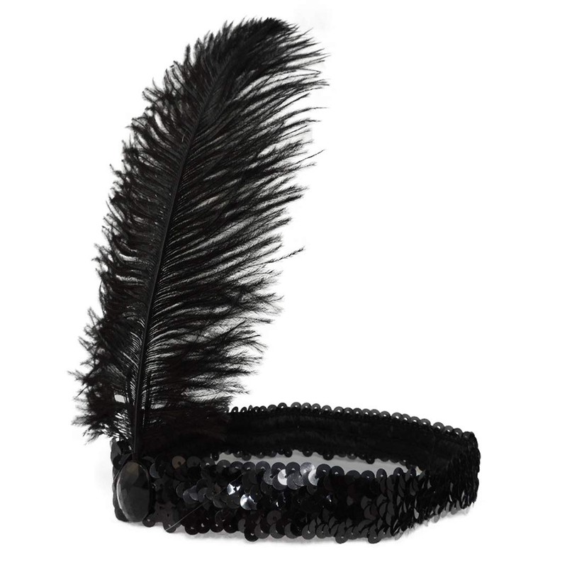 Roaring 20's Black Sequined Showgirl Flapper Headband with Feather