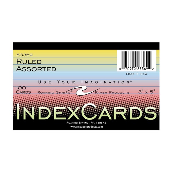 Roaring Spring Index Cards, 3" x 5", Assorted Colors, Lined, 100/Pack