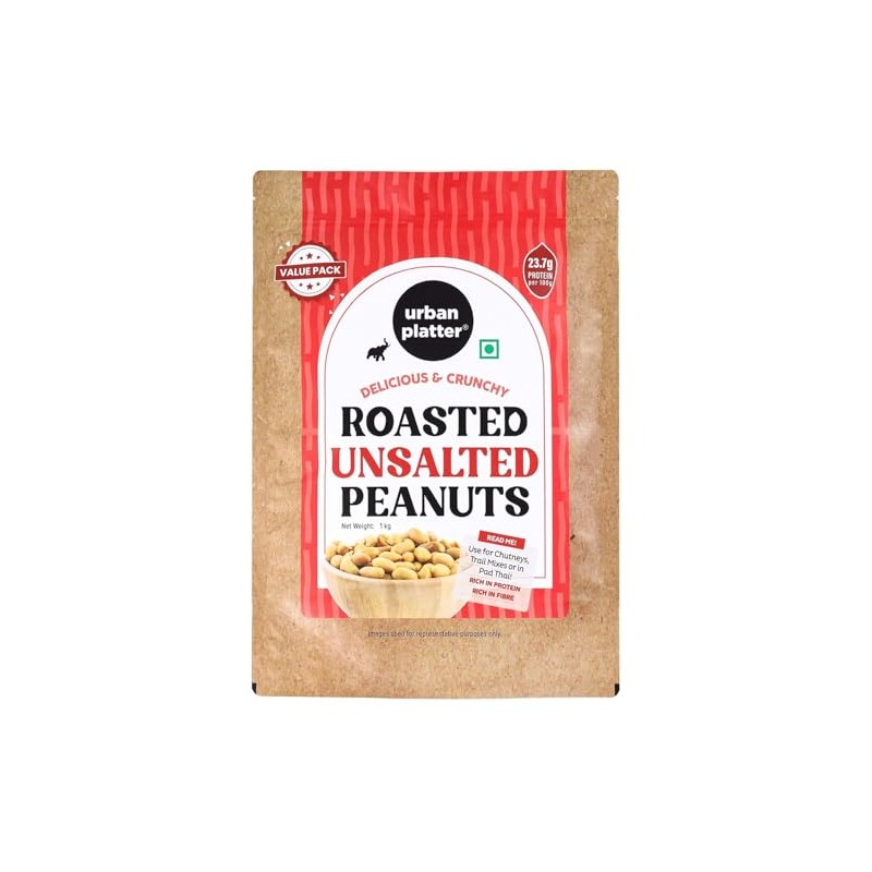 Discover Urban Platter's premium roasted unsalted peanuts, perfectly crafted for the discerning snacker. This generous 1kg value pack delivers delicious, crunchy peanuts with their skins removed, offering a pure, natural taste without added salt. Packed with an impressive 23.7g of protein per 100g, these peanuts are an excellent source of nutrition and dietary fibre. Their versatility shines through in multiple culinary applications - enjoy them as a wholesome snack, incorporate them into chutneys, create exciting trail mixes, or use them in Pad Thai dishes. The resealable packaging ensures maximum freshness throughout use. Store in a cool, dry place away from sunlight to maintain their delightful crunch and natural flavour. These vacuum-packed peanuts from Bharuch offer consistent quality and taste in every handful, making them perfect for both snacking and cooking needs.
