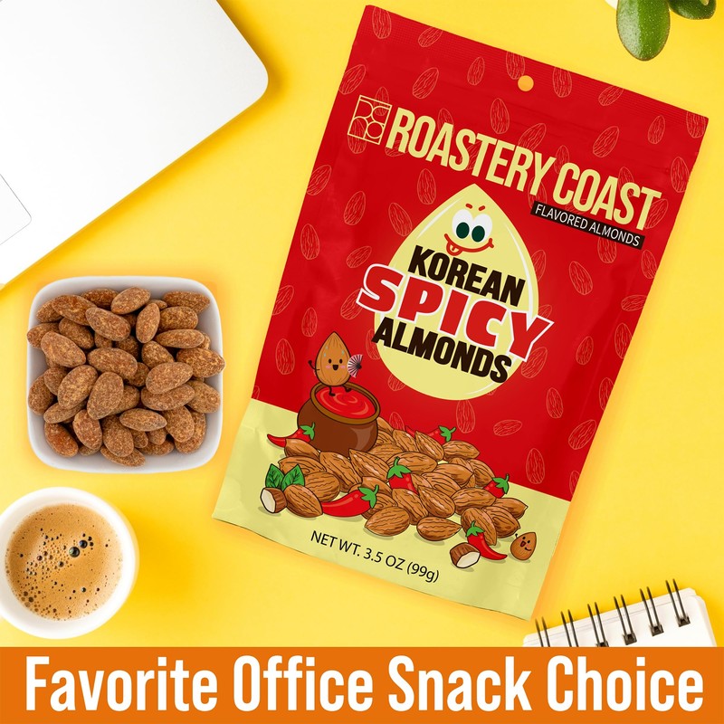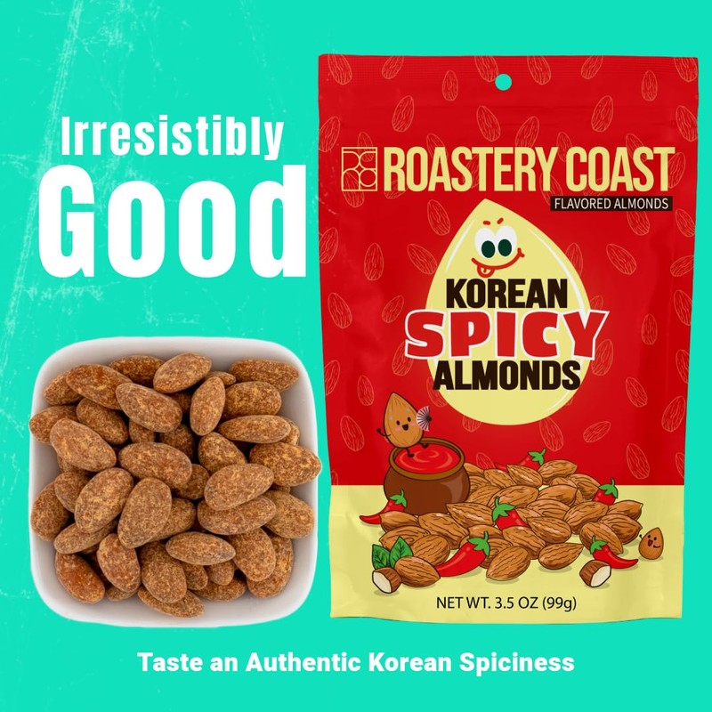 Roastery Coast - Spicy Korean Almonds | Sweet and Spicy | Adddictive | Flavorful | After School Snack | Gluten Free | Plant Protein | Office Snack (4 Packs)