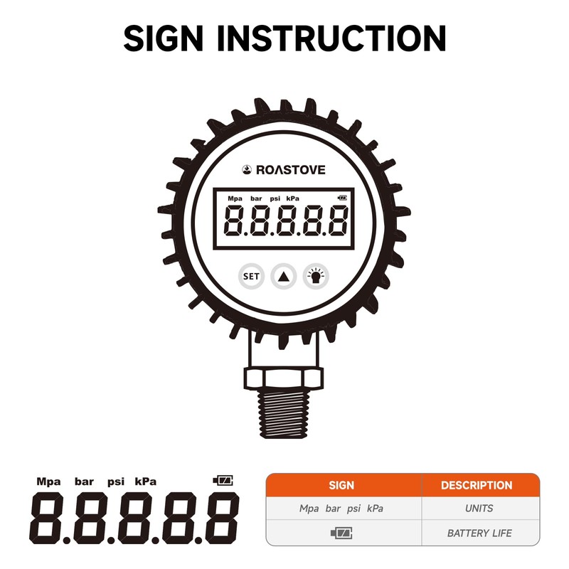 - 【RANGE】5 digit display, 3 units, 3000psi, 200bar, 20Mpa, 150% over load.