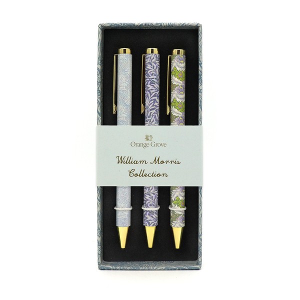 - SET OF 3 PENS: Set of 3 mixed design William Morris ballpoint pens in branded presentation box.