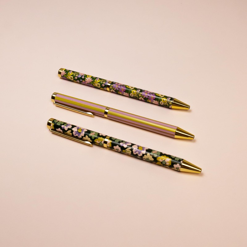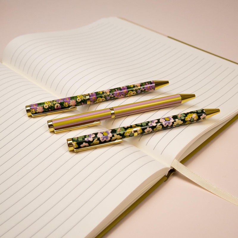 - SET OF 3 PENS: Set of 3 mixed design vibrant bloom ballpoint pens in branded presentation box.