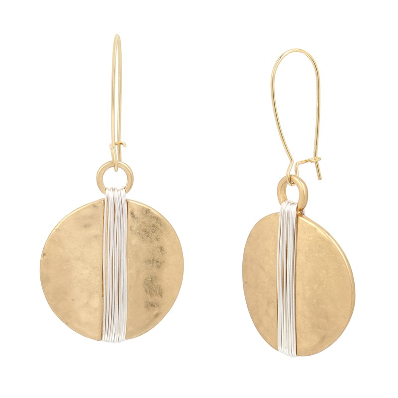- MODERN EARRINGS : Statement large-size dangle earrings featuring elegant long ear wire with hammered circle drop adorned with contrasting silver-tone wire wrapped details.