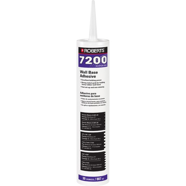 ROBERTS 7200 Superior Wall Base Adhesive is a superior performing adhesive with quick grab and rapid set-up for the fast installation of wall base. ROBERTS 7200 is formulated with strong holding power for adhering vinyl, rubber and carpet wall base. The 7200 formula is solvent free, zero Volatile Organic Compound (VOC)s (calculated) and a VOC Compliant adhesive that meets the strict requirements of the South Coast Air Quality Management District and may contribute one LEED point as a "low emitting adhesive". ROBERTS 7200 is protected by gold guard, an protection system that inhibits the growth of mold, mildew and odor causing bacteria in both wet and dry adhesive.