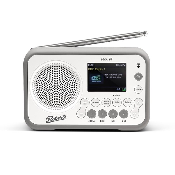 Roberts PLAY20 Compact and Portable DAB/DAB+/FM Digital Radio, Rubber-Protected, Full Colour Screen, White