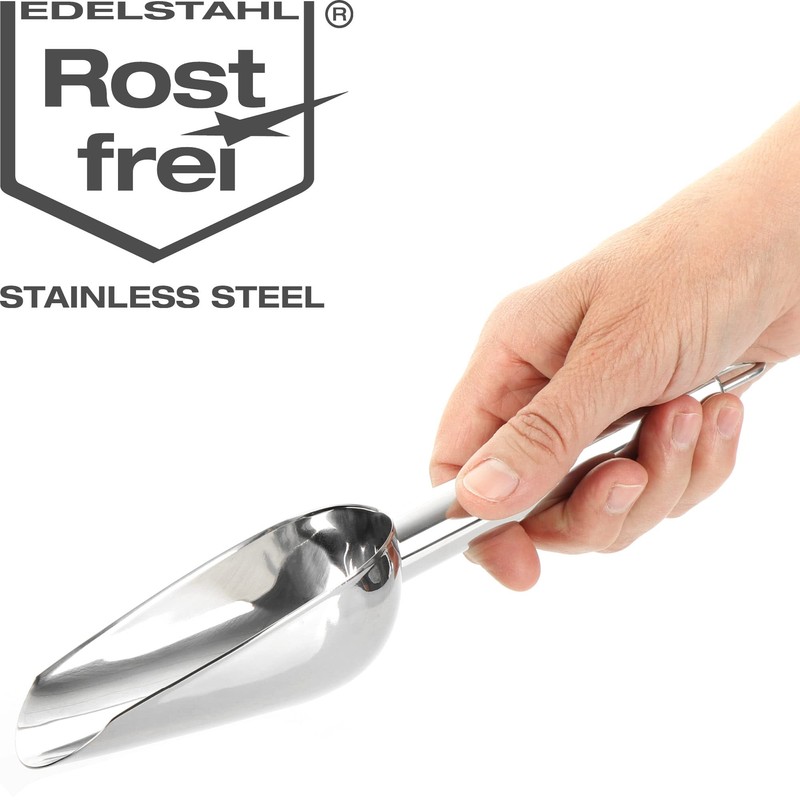 - Box contents: 1 x ice scoop. Dimensions: approx. 23.5 x 6.5 x 3.5 cm (length x width x height). Material: stainless steel. Colour: silver
