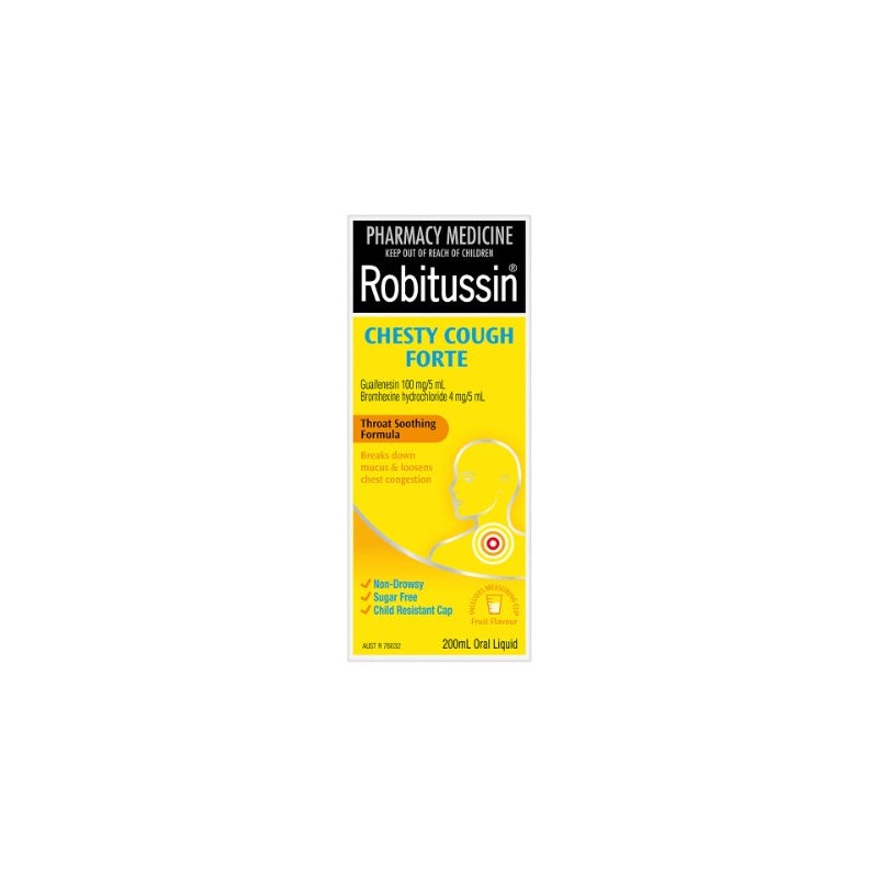 Product Description:Robitussin Chesty Cough Forte for symptomatic relief from congested chests and coughs due to the common cold. Robitussin liquid coats and soothes the throat.