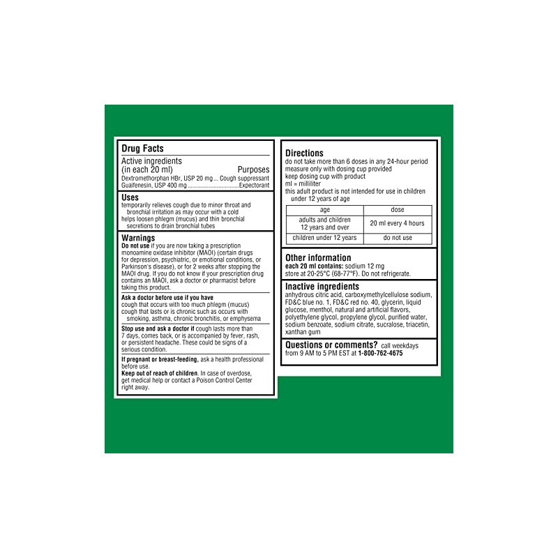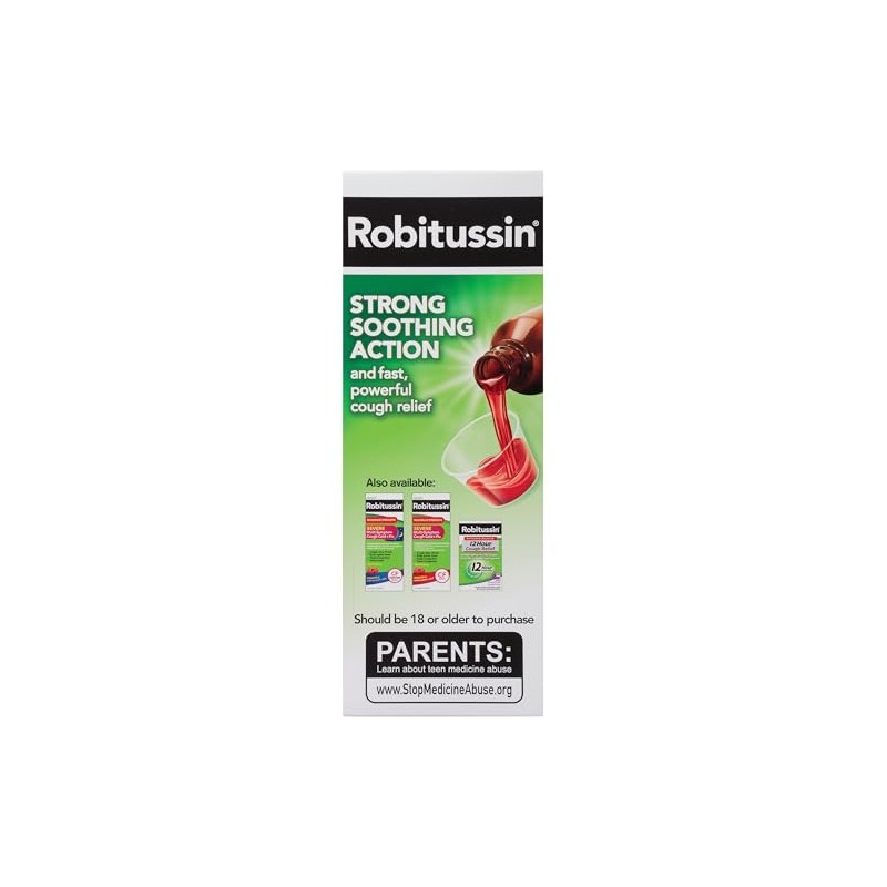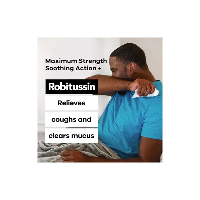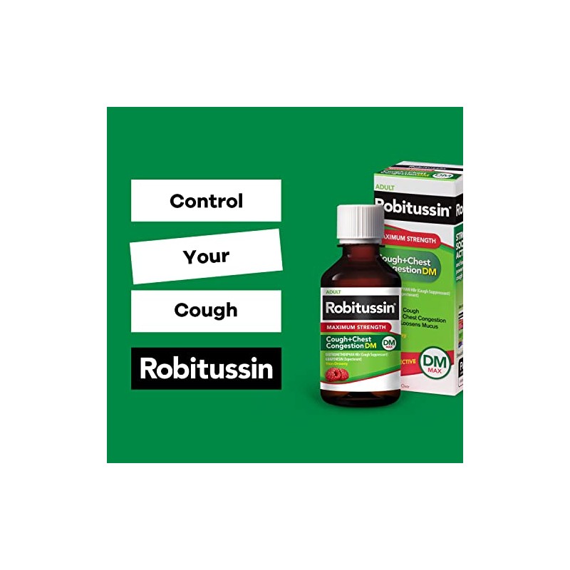 Frequent coughs and chest congestion have met their match. Get fast, effective relief from your worst cold symptoms with Robitussin Maximum Strength Cough + Chest Congestion DM. This cough medicine not only works to control your cough, but it also thins and loosens mucus to help make your coughs more productive. The strong, soothing action of max-strength Robitussin Cough Syrup comes in a great raspberry flavor D also available in liquid-filled capsules. For adults and children ages 12 and over, Robitussin Maximum Strength Cough + Chest Congestion DM should be taken in 20 mL doses every four hours; do not take more than six doses in any 24-hour period. For nighttime cough relief, try Robitussin Maximum Strength Nighttime Cough DM.