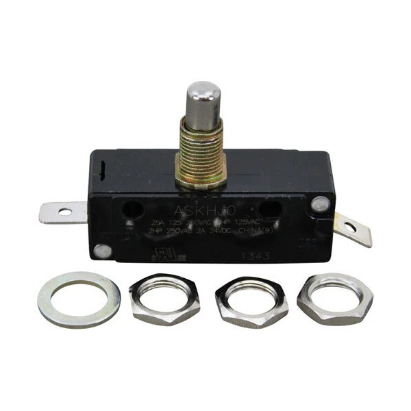 This item for Robot Coupe R828 is a push button switch designed for various models. It features a momentary on/off action and can handle twenty-five amps at one hundred twenty-five or two hundred fifty volts. This switch is compatible with several Robot Coupe mixers, including R-2, R-4, and R-4X, among others. Suitable for replacement in commercial kitchen appliances, it ensures reliable operation.