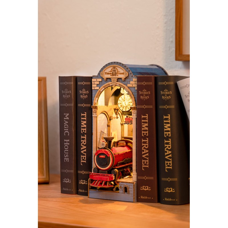 ROBOTIME DIY Book Nook Kit Insert Bookcase Book Stand 3D Wooden Puzzle DIY Miniature House Wood Bookend Book Nook Model Building Kit with LED Light Booknook Decoration (Time Travel)