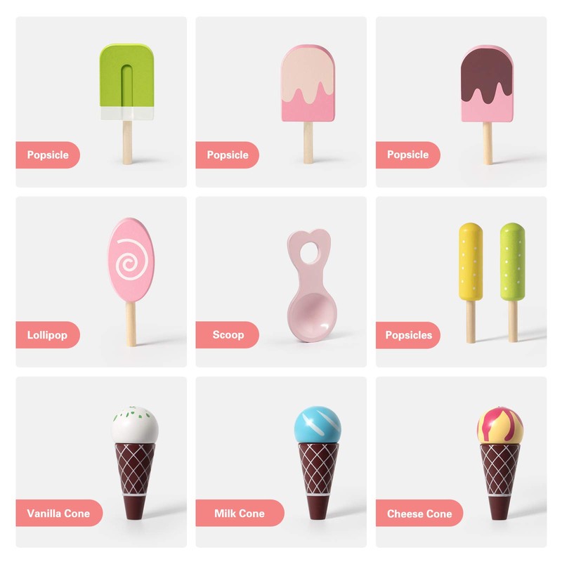 - CUTE & EDUCATIONAL: ROBUD Wooden Ice Cream Toys is design to Promote Language and encourages imaginative play, Including Pretend Ice cream, Ice cream cones, Ice Cream Truck.