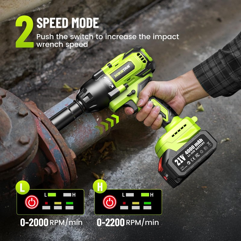 - 【𝗘𝗳𝗳𝗶𝗰𝗶𝗲𝗻𝘁 𝗕𝗿𝘂𝘀𝗵𝗹𝗲𝘀𝘀 𝗠𝗼𝘁𝗼𝗿 -- 𝗨𝗽 𝘁𝗼 22𝟬𝟬𝗥𝗣𝗠 】-- The 663 Ft-lbs (900N.m) cordless impact wrench has a powerful and long-lasting performance and features 2 - speed modes (0 - 2000/0 - 2200 RPM). Compared to traditional motors, impact drivers run 60.5% longer, are quieter, are spark-free, and are easy to use, making them an essential tool for the job