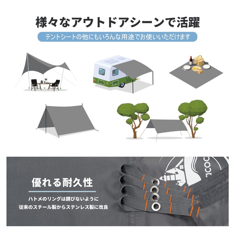 - (Double-sided Waterproof Treatment & Stainless Steel Grommets) This tent sheet has a water resistance level equivalent to 10,000 mm (PU10,000 mm) (1 side is also treated to prevent the tent from getting wet even on rainy days. The other side is water resistant to prevent moisture from the ground, so you don't have to worry about water intrusion. In addition, the eyelets are made of stainless steel to prevent rust