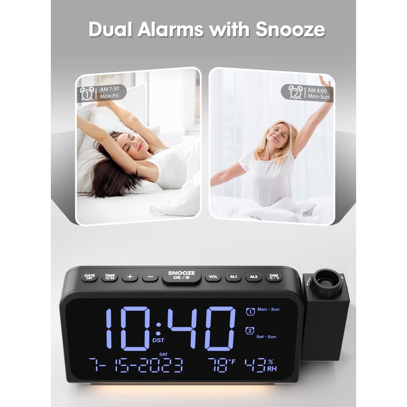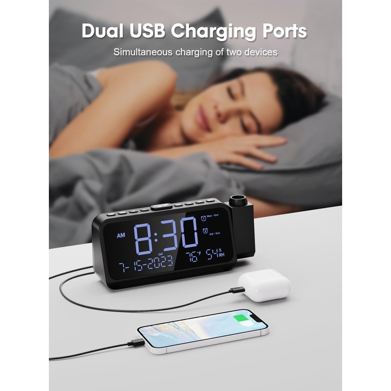 ROCAM - Reloj despertador de proyección, reloj digital con proyector de 350 ° en la pared del techo, doble alarma para dormitorios con modo de día de la semana y fin de semana, 2 puertos USB, atenuador, temperatura, humedad, luz nocturna, repetición