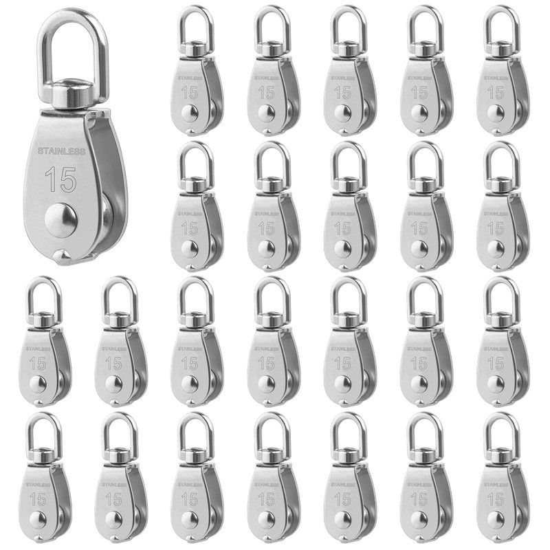 Rocaris 25 Pack M15 Lifting Single Pulley Block 304 Stainless Steel Crane Swivel Hook Double Pulley Roller Loading