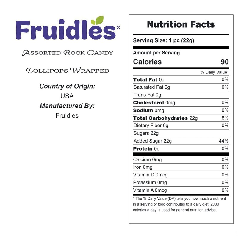Fruidles Rock Candy Lollipops Pops Suckers, Variety Color Assortment, Individually Wrapped, 6.5" (6-Pack)