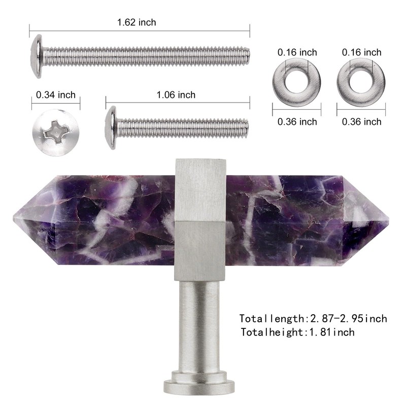 • Pack of 2 Stone Drawer Knobs: Each package has two hexagonal prism knobs, and each knob has two screws of different length. The handle has a total length of 2.79-2.99 inches (71-76mm), a width of 1.81-1.85 inches (46-47mm), and a thickness of 0.78-0.87 inches (20-22mm). The crystal stone is 2.79-2.99 inches (71-76mm) in length and 0.78-0.86 inches (20-22mm) in width. One screw is 1.06 inches (27mm) in length and the other is 1.62 inches (41mm) in length.