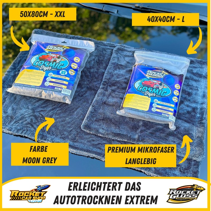 - ✔️ Water magnet – The Rocket Gloss Cosmic Dryer is a real water magnet and makes drying your vehicle a breeze. Thanks to the ultra-absorbent microfibre with 1300 g/m², it absorbs large amounts of water in one stroke - without annoying drips or streaks.