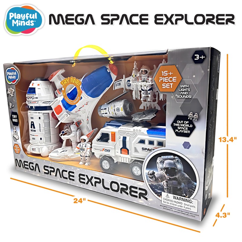 Blast off into an out-of-this-world adventure with the Playful Minds Rocket Space Toy! This 15-piece playset is perfect for young explorers and aspiring astronauts. Designed to inspire curiosity and creativity, our space toy set includes a take apart rocket, space shuttle, moon rover, 2 astronauts, satellite, jet pack, 2 sky riders, and additional accessories that will keep your child engaged for hours. Each piece in this set is crafted with care and precision, ensuring that your child gets the best play experience possible. The take-apart rocket and space shuttle are perfect for little engineers, helping to develop fine motor skills and problem-solving abilities. With the added excitement of lights and sounds, this playset brings the thrill of space exploration right into your home. The Playful Minds Rocket Space Toy is not just fun, it's educational too! The set encourages STEM learning by allowing kids to build, disassemble, and reassemble their own rocket and shuttle. This hands-on approach to learning helps children understand basic engineering principles while fostering a love for science and space. Packaged in a large, colorful 23" box, this set is perfect for gift giving. Whether it's for a birthday or holiday, the Playful Minds Rocket Space Toy is sure to be a hit with boys and girls alike. Plus, parents can rest easy knowing they are giving their children a high-quality toy from Thin Air Brands, a trusted company based in Colorado, USA. Get ready for takeoff with the Playful Minds Rocket Space Toy and let your child's imagination soar!