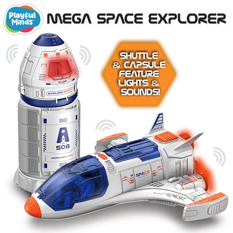 Blast off into an out-of-this-world adventure with the Playful Minds Rocket Space Toy! This 15-piece playset is perfect for young explorers and aspiring astronauts. Designed to inspire curiosity and creativity, our space toy set includes a take apart rocket, space shuttle, moon rover, 2 astronauts, satellite, jet pack, 2 sky riders, and additional accessories that will keep your child engaged for hours. Each piece in this set is crafted with care and precision, ensuring that your child gets the best play experience possible. The take-apart rocket and space shuttle are perfect for little engineers, helping to develop fine motor skills and problem-solving abilities. With the added excitement of lights and sounds, this playset brings the thrill of space exploration right into your home. The Playful Minds Rocket Space Toy is not just fun, it's educational too! The set encourages STEM learning by allowing kids to build, disassemble, and reassemble their own rocket and shuttle. This hands-on approach to learning helps children understand basic engineering principles while fostering a love for science and space. Packaged in a large, colorful 23" box, this set is perfect for gift giving. Whether it's for a birthday or holiday, the Playful Minds Rocket Space Toy is sure to be a hit with boys and girls alike. Plus, parents can rest easy knowing they are giving their children a high-quality toy from Thin Air Brands, a trusted company based in Colorado, USA. Get ready for takeoff with the Playful Minds Rocket Space Toy and let your child's imagination soar!