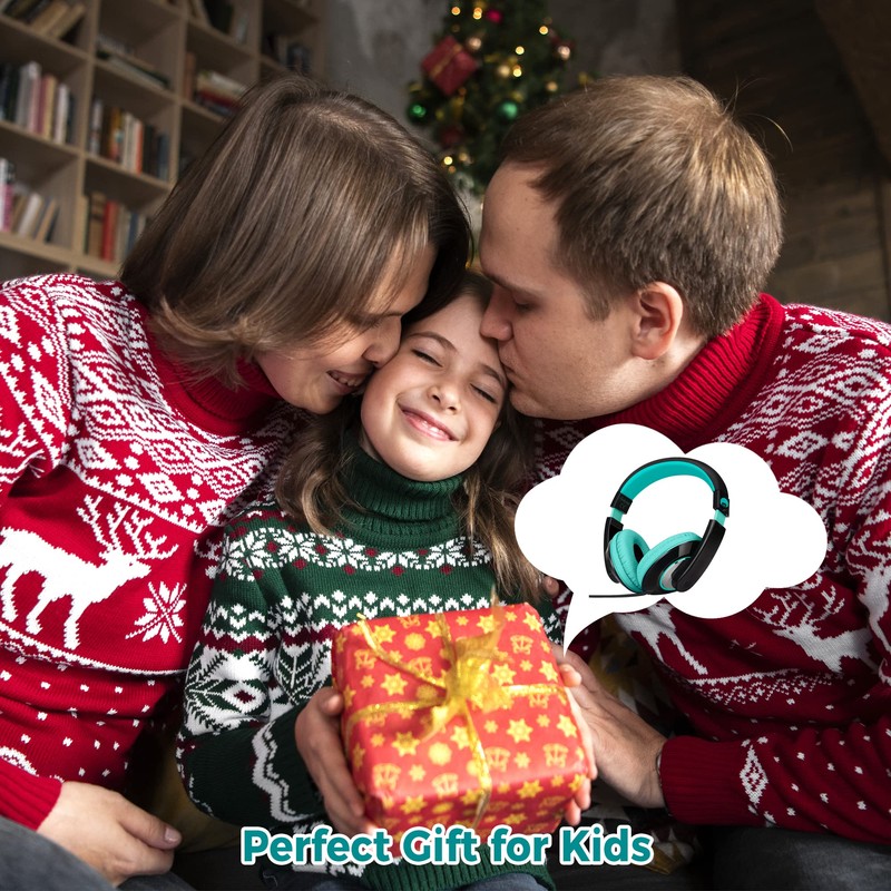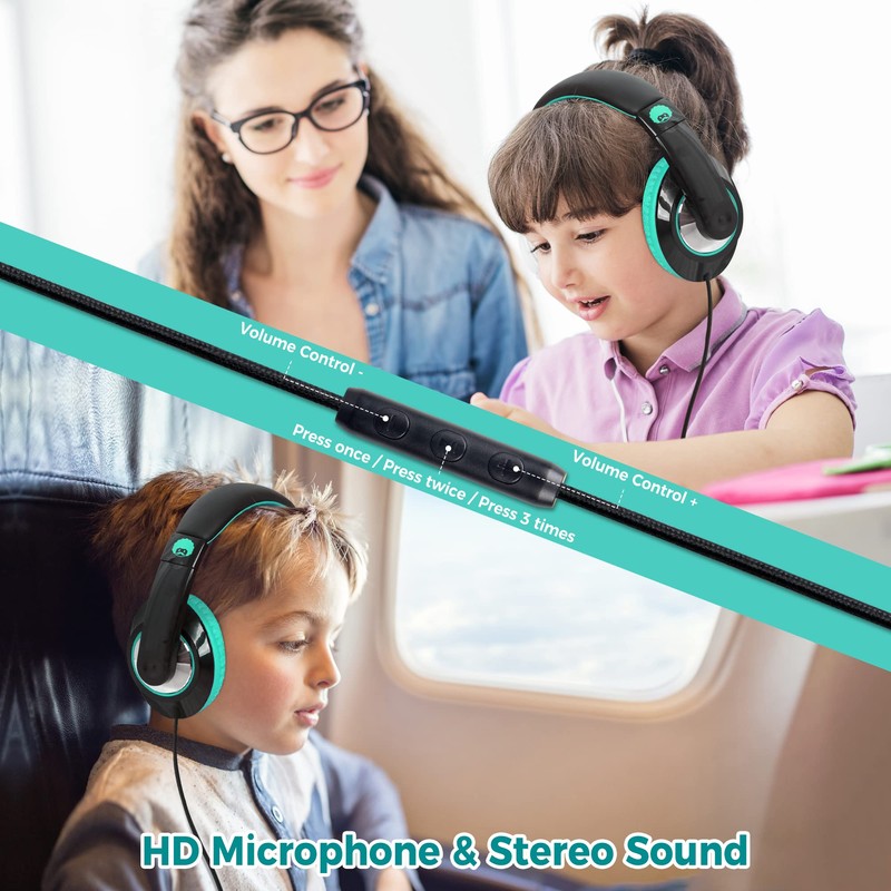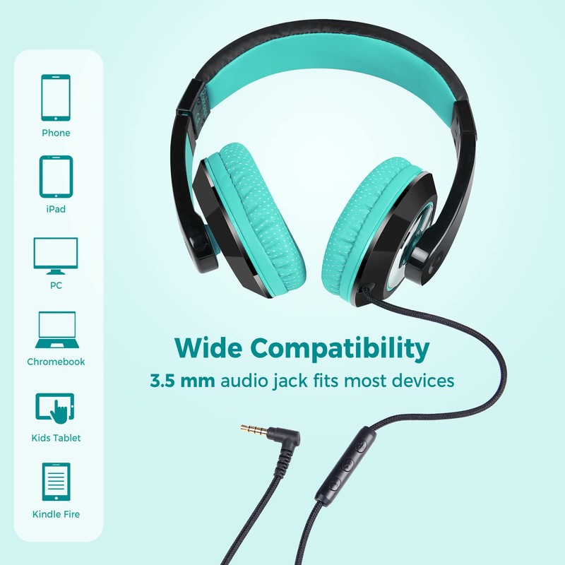 Rockpapa Comfort+ Kids Headphones, Wired Headphones Over Ear Headphones with Microphone for Kids Children Adult, Stereo Sound, Adjustable Headphones for School/Travel/Phone/PC/MP3-Black Teal