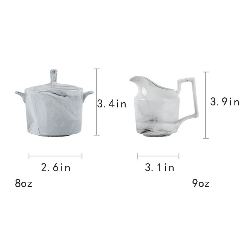 - Size: Milk Jug (3.1 x 3.9 inches / 9 oz), Sugar Bowl (2.6 x 3.4 inches / 8 oz).