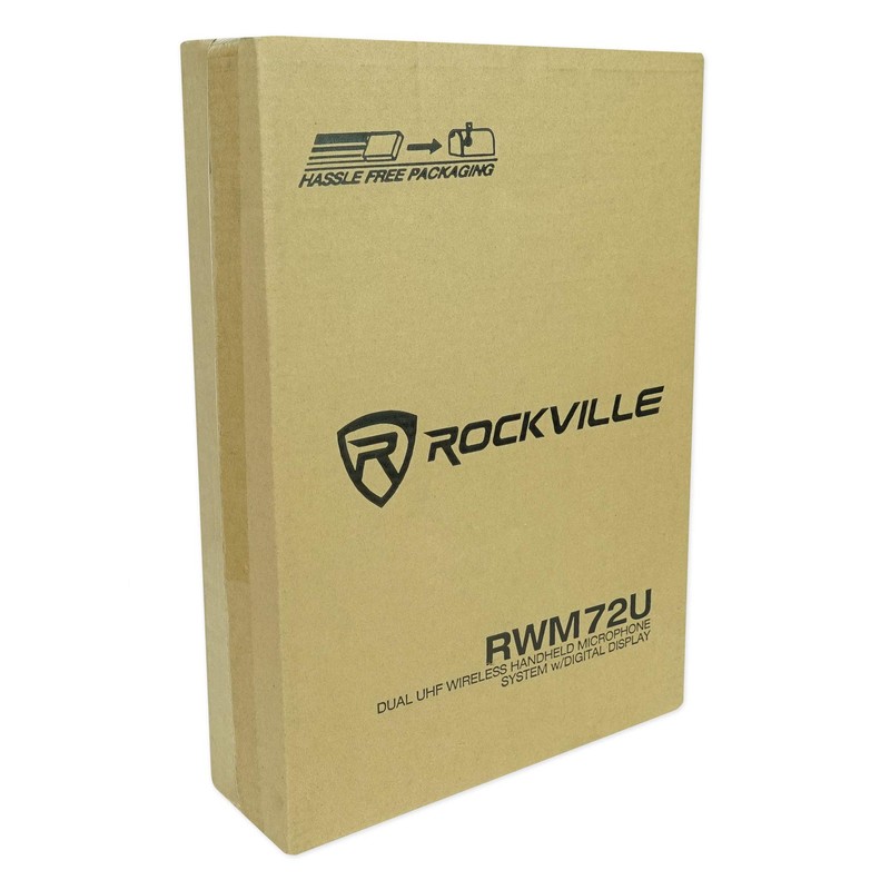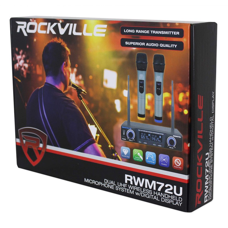 - Features of RWM72U: Rockville RWM72U Dual UHF Wireless Handheld Microphone System Digital Display, High performance and long range, Includes microphone receiver and (2) handheld microphones, High sensitivity cartridge, Unidirectional, wireless cardioid polar pattern, Dual filter design to limit feedback and interference