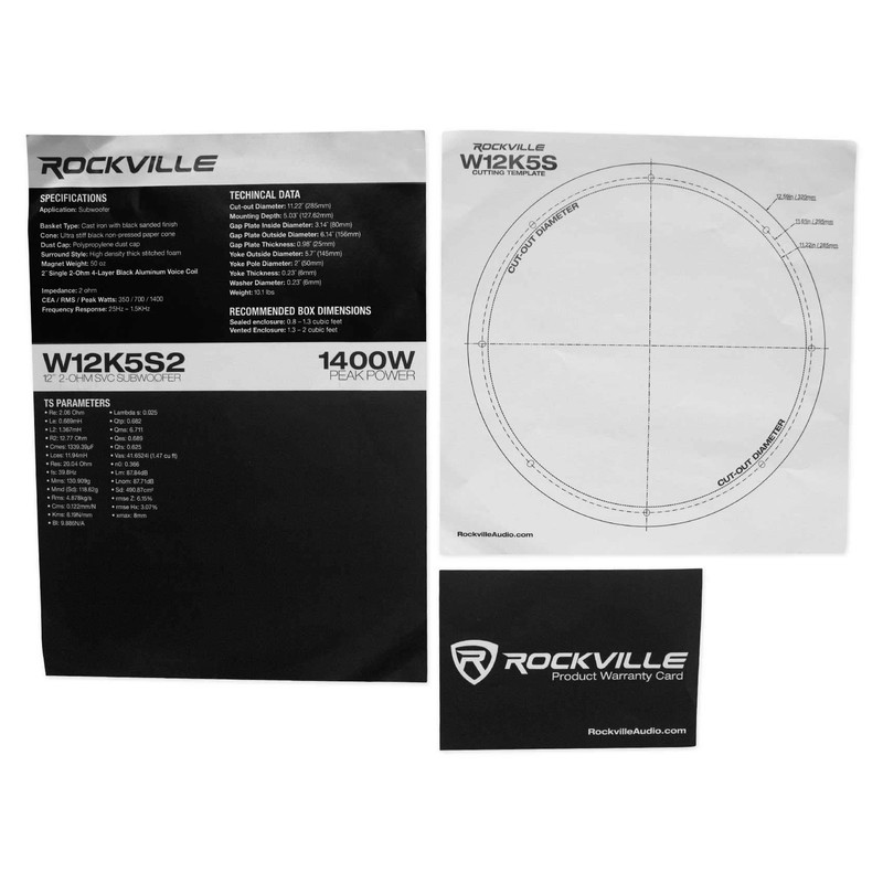 - Features: Rockville W12K5S2 K5 Series 12" 2-Ohm Car Subwoofer, Peak Power Handling: 1400 Watts, Program Power Handling: 700 Watts, CEA Rated RMS Power Handling: 350 Watts, 2" 4-Layer Black Aluminum Voice Coils Wound with OFC (100% Copper) Wire, The wire we use to wind the voice coil is imported from Japan which is way better quality than the standard China wire, 50 Oz High Quality Magnet, Cast Iron Basket With Black Sanded Finish