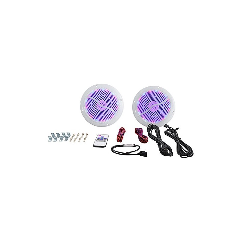 - Includes: Pair of 6.5" marine speakers, 16.4 feet of Speaker Wire, Mounting Screws, and LED Remote Controller.