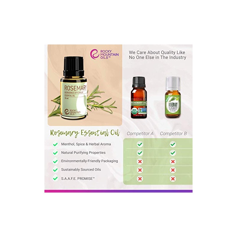 - 100% Pure Rosemary essential oil: Rosemary Essential Oil has a strong herbaceous, slightly woody, balsamic aroma presenting a top-middle fragrance note; Rosemary Essential Oil is included as part of our Rocky Mountain Oils Skin Care, Wellness, and Cleaning collections