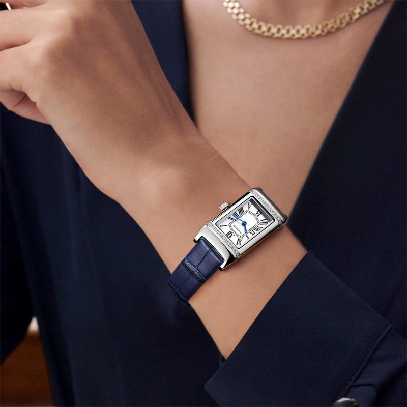 • Diseño único: funda ultra plana, forma rectangular, esfera blanca, número romano, bisel rectangular de 70 piedras preciosas, cabeza de corona azul, agujas azules de doble aguja, bisel plateado, atractiva funda en forma de "H" para mayor elegancia