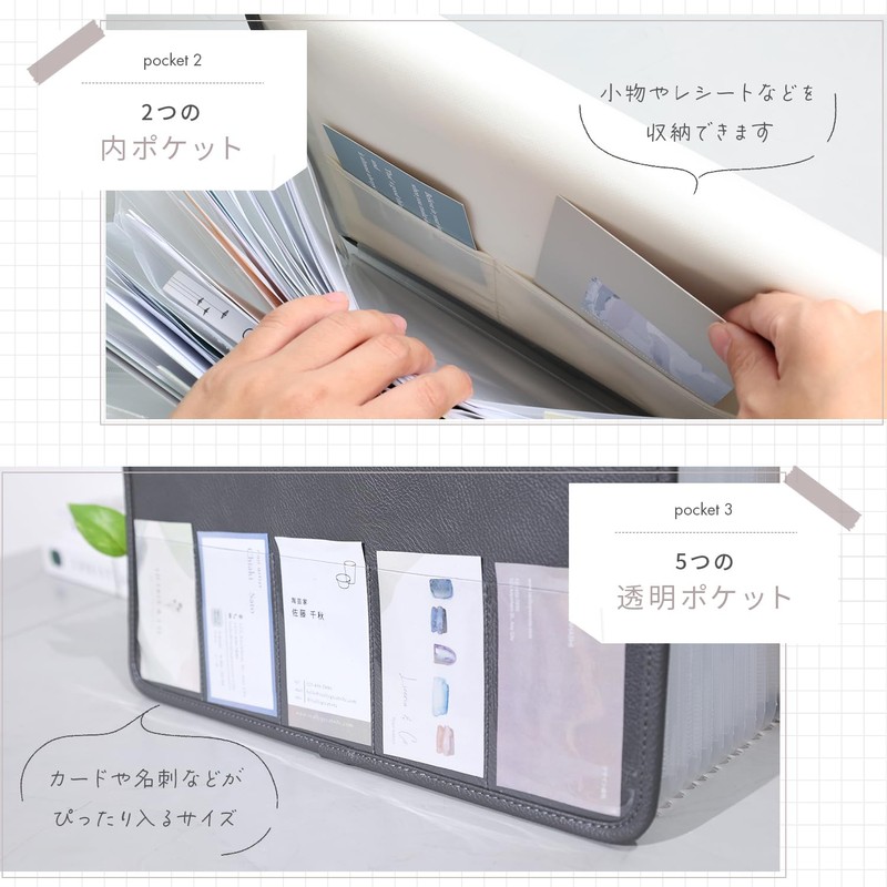 - (We wanted a design and functionality) 1. 13 pockets and A4 sizes can be stored. 2. There are 2 inner pockets, so you can put your important mail in this case. 3. 5 clear pockets to fit your cards, business cards, etc. For business occasions and point cards. 4. The included indexes allow you to separate and organize them by category. 5. The spine is included, so you can see the contents by person, company, and age at a glance. 6. It is made with a jabbalah specification, so it can be opened easily and seen. You can store it vertically and horizontally. 7. High design allows you to show it off!