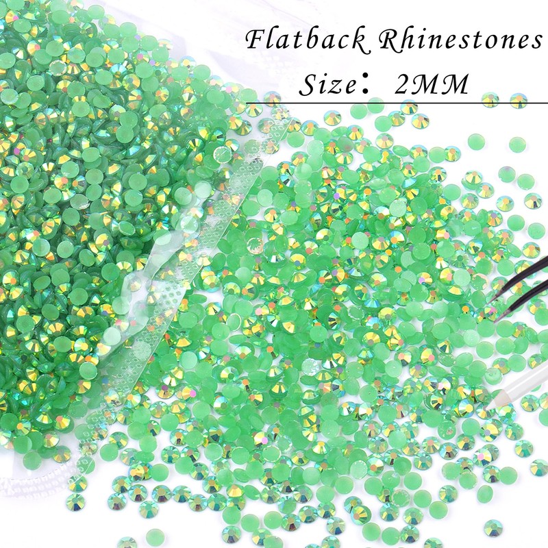 - Jelly Flatback Nail Rhinestones:You Will Receive A pack of 2MM 5000Pcs Flatback Dark Green AB Rhinestones With Wax Pen and Tweezer.Flatback Jelly AB Rhinestones Will Make Your Nails More Bedazzling Kit and Glamour.The Light Shine Into AB Crystal To Make It Reflect Iridescent And Twinkling Radiance.Flat Back Design Can Be Easily Applied To Natural And Artificial Nails.