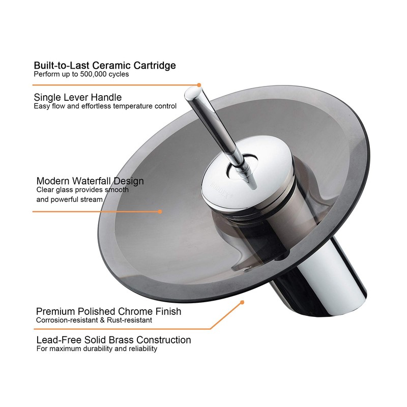 - HIGH QUALITY -- Waterfall bathroom sink faucet made of heavy-duty all solid brass, durable stainless steel installation parts, High end polished chrome finish of the 1 hole glass faucet is highly reflective. Waterfall sink faucet with unique disk shaped clear glass rinser adds a modern look to your bathroom