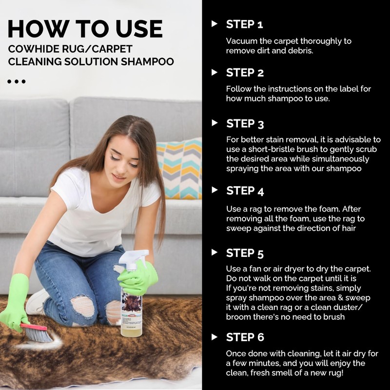 - ใ ๐๐๐๐ฉ ๐๐ฅ๐๐๐ง๐ข๐ง๐ ๐๐ก๐๐ฆ๐ฉ๐จ๐จ ใ: Activate the power of rug deep cleaning with Rodeo cowhide rug & carpet cleaning solution! Our exclusive USA-made rug cleaner solution formula refreshes cowhide rugs by removing dirt, smells, and stains. Bring out the colors in your tanned animal hides!