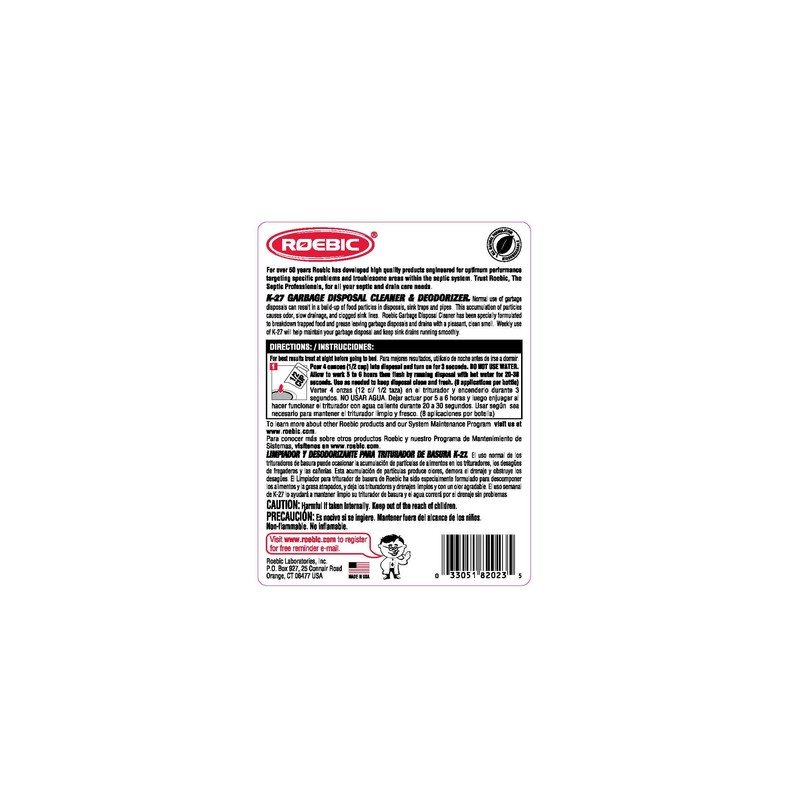Roebic K-27 Garbage Disposal Cleaner contains a combination of live bacteria and biodegradable surfactant, that break down grease, fats and food residues. K-27 cleans and degreases plumbing surfaces within the garbage disposal while leaving a, clean fresh scent. Regular (weekly) use will keep disposal running clean and odor free.