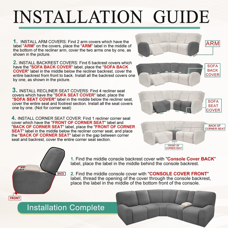 - Complete 15-Piece Set (Fits 5-Seat Sofas with 1 console): The recliner sectional couch covers include 6 backrest covers, 5 seat covers, 2 armrest covers and console cover set—all designed to hug your sofa's shape like a glove. Each piece fits snugly like a custom-made cover. In addition, various combination sets are provided for different types of sectional sofas. Please refer to the measurement guide in the picture to measure your sofa before purchasing
