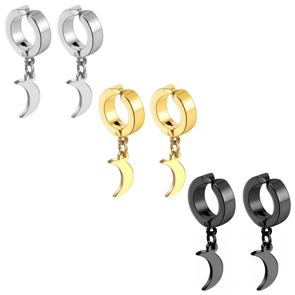 Rofusn Black Clip On Moon Dangle Hinged Earrings Hoop, Stainless Steel Non-Piercing Punk Earrings Jewelry-3pairs