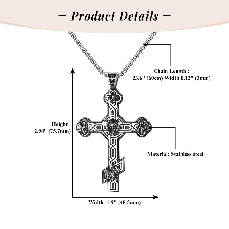 - Stainless Steel Pendant Necklace - No Fading. Features intricate Byzantine-style craftsmanship with pendant dimensions of 2.98" (75.7mm) height and 1.9" (48.5mm) width, Come with a sturdy box chain length 23.6" (60cm)