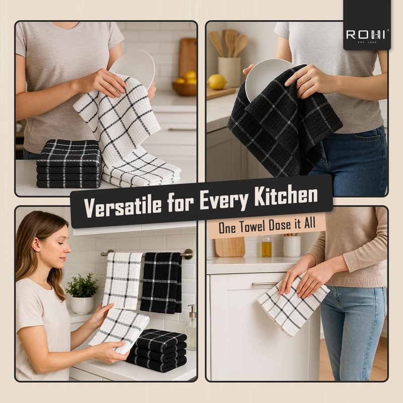 Rohi 6 Pack Tea Towels for Kitchen 100% Cotton โ Lint Free & Absorbent Tea Towels with Hanging Loop โ Durable Kitchen Towel for Drying, Cleaning & Wiping โ 45x66cm, Black & White