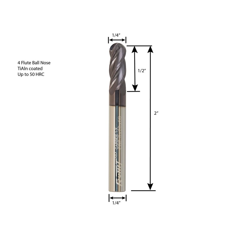 Rohit 4 Flute C-102 Solid Carbide Micro Grain Ball Nose End Mills 1/4" Diameter (0.25 ") x 1/2" Cut Length, 1/4" Shank Diameter x 2" Overall Length. 30 Degree Helix Angle