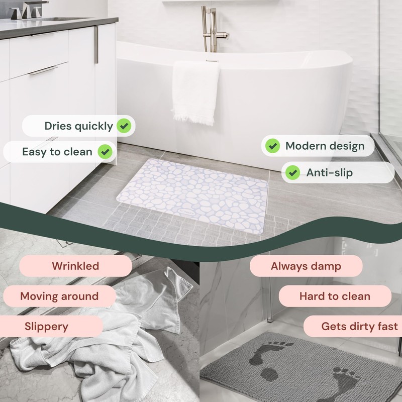- Superior Water Absorption: Our bath mat is engineered with advanced diatomaceous technology to guarantee consistent water absorption throughout its lifespan, unlike others that experience an absorbency decline. Stop to soggy floors and welcome a reliable quick dry mat into your bathroom routine, ensuring your safety and comfort.