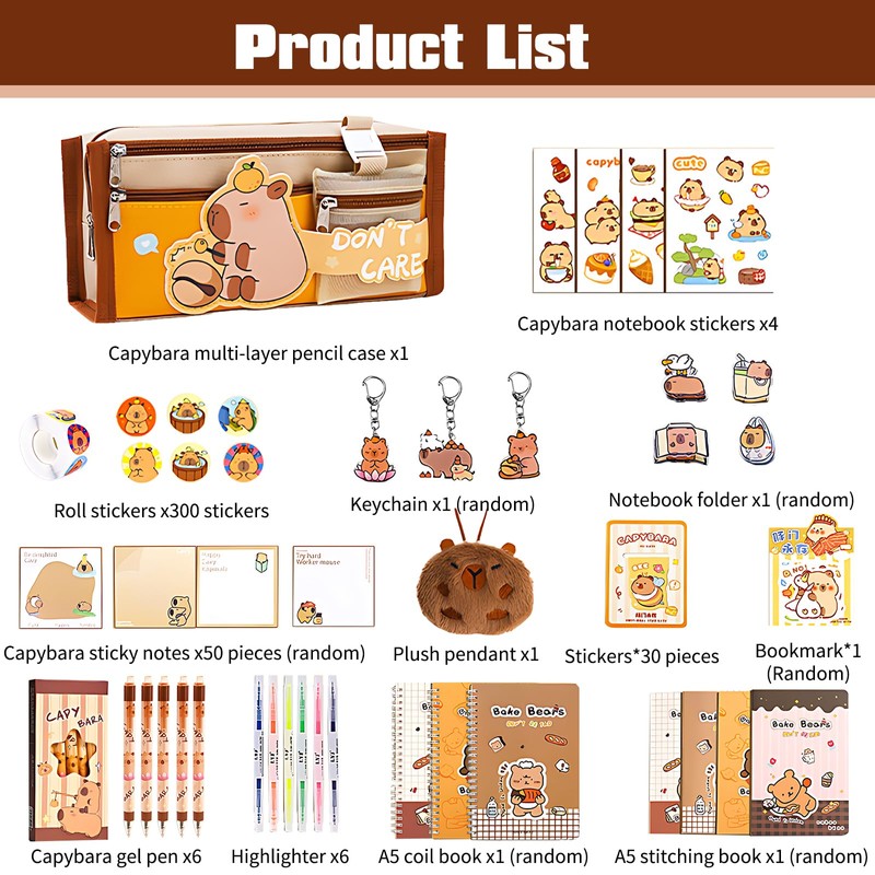 - Packing list: our capybara pencil case set includes 1 capibara multi-layer pencil case, 1 A5 sewing book (random), 300 curling stickers, 6 capibara gel pens, 6 highlighters, 1 A5 sewing book (random), 1 capibara gift bag, 50 capibara notes (random), 30 1 leebookbookbookCharacters (random), 4 Capibara notebook stickers, 1 plush pendant, 1 notebook clip (random), 1 key ring (random).