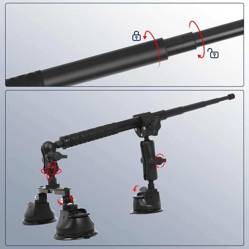 ROINROJI Car Suction Mount Kit Invisible Selfie Stick Compatible for Insta360 X5/X4/X3/X2/X/One RS/R and GoPro Max 11-47.6 in Triple Suction Cups Dual-Sleeve Arm 360°Rotating Action Camera Mount