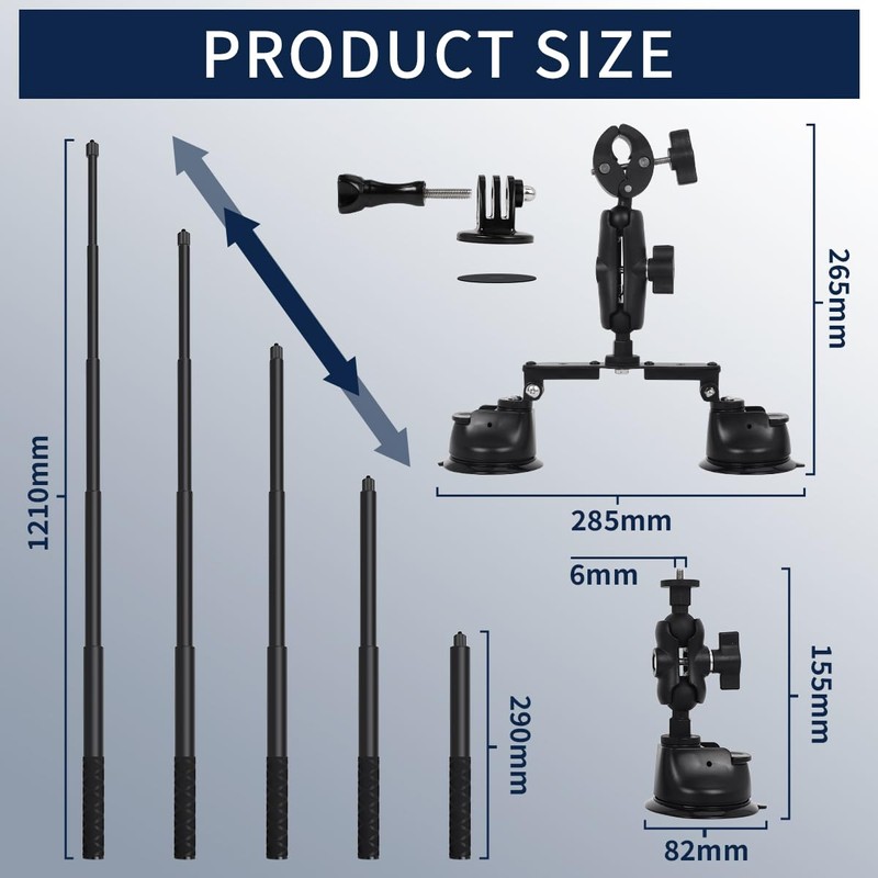 - 【Superior Quality】Selfie stick and mount main body made of aviation aluminum alloy, suction cups of high-strength rubber, UV-resistant and stable, passed 1000+ installation durability tests.