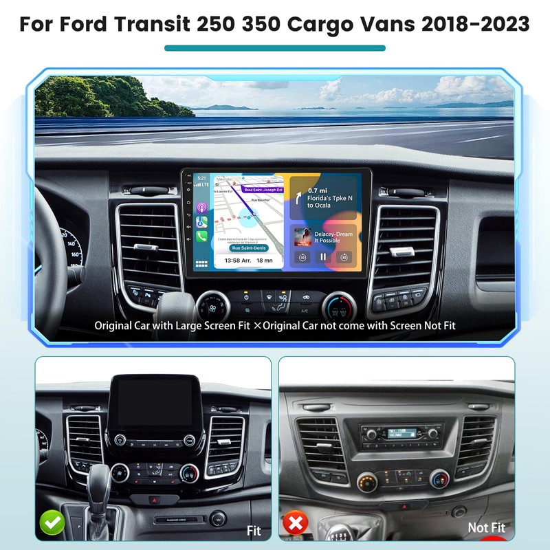 - Applicable Models and Years: This Android Car Stereo Fit for Ford Transit 250 350 Cargo Vans 2018 2019 2020 2021 2022 2023, Comes With Plug and Play Cable. Designed to match the factory dashboard without modification or splicing. Please send us your car's model, produce year and a car dashboard picture by Amazon chat, we will help you to check if this car stereo is suitable for your car