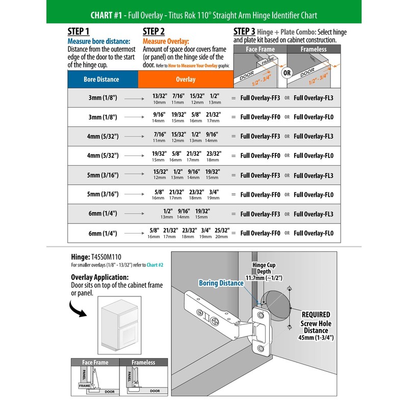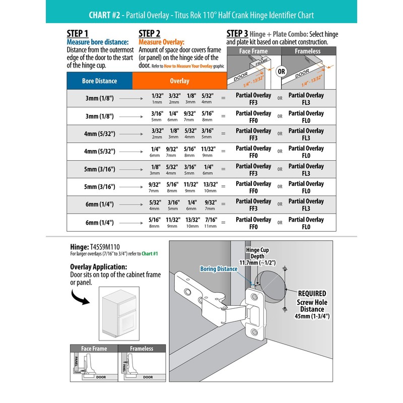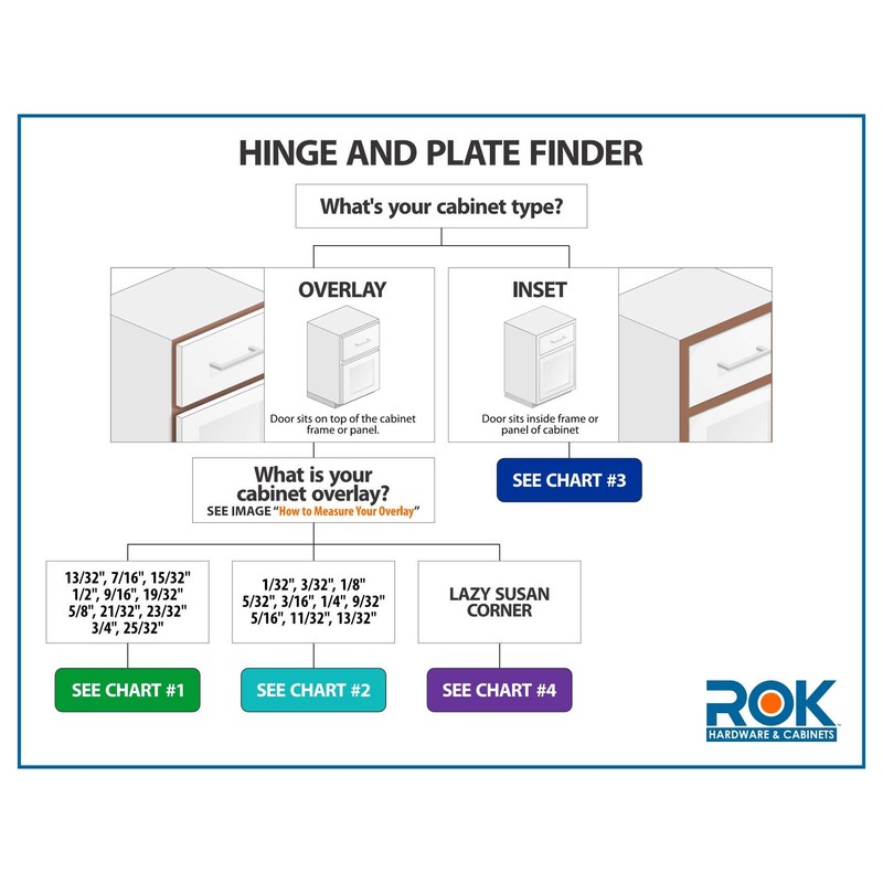 - MANY OVERLAYS AVAILABLE - Designed for overlay cabinets, from 1/2" to 3/4" (refer to “How to Measure Your Overlay” graphic in product photos). For smaller overlays (1/4” to 13/32”) refer to Chart #2 in product photos. To determine mounting plate required for your application, refer to Chart #1. For inset applications, refer to Chart #3.