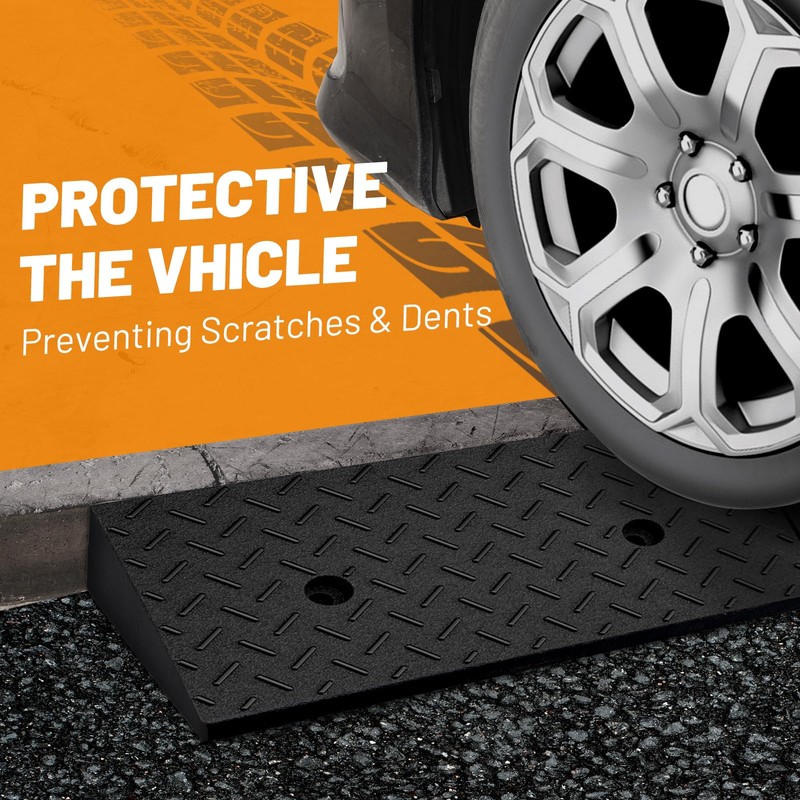 - The car rubber curb ramp is made of high-density rubber which has high strength, durable, resistant to ultraviolet light, oil, solvents, gas, the elements and extreme temperatures.The size of rubber kerb ramp is 39.4(L) x 9.8(W)x 2(H) inch. Capacity: 3T/6600lbs.