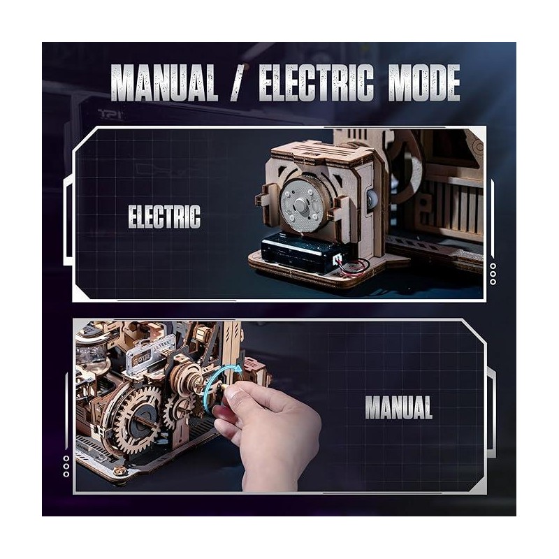 Get ready for a whole new visual feast! This is a marble run model, which is designed in dark gray and dotted with silver. The brand-new product of ROKR Track Maze City, Marble Spaceport (LGC01) was born with the theme of future space technologies. The uniqueness of this marble run lies in its complex mechanical structures, which are 6 diversion mechanisms and 5 tracks. Turning the handle, you can watch steel balls rolling through different tracks. With the highly transparent PC and PS materials, you can clearly observe the movement of each ball. In addition, Marble Spaceport (LGC01) has an upgraded design with two drive modes, which are manual mode and electric mode. Switch between these two modes as you prefer to get more fun. Now, let’s start Marble Spaceport to make it run and explore a new game of Marble Run.